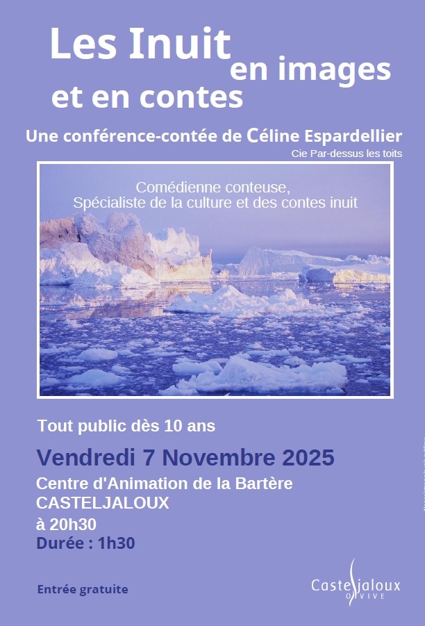 Cette conférence spectacle présente la culture inuit à travers des thématiques emblématiques : milieu naturel, ville et habitat, transports, chasse et pêche, vêtements, ressources économiques, réchauffement climatique, art et transmission..., chacune illustrée d'images projetées en diaporama et accompagnée d'un conte traditionnel.